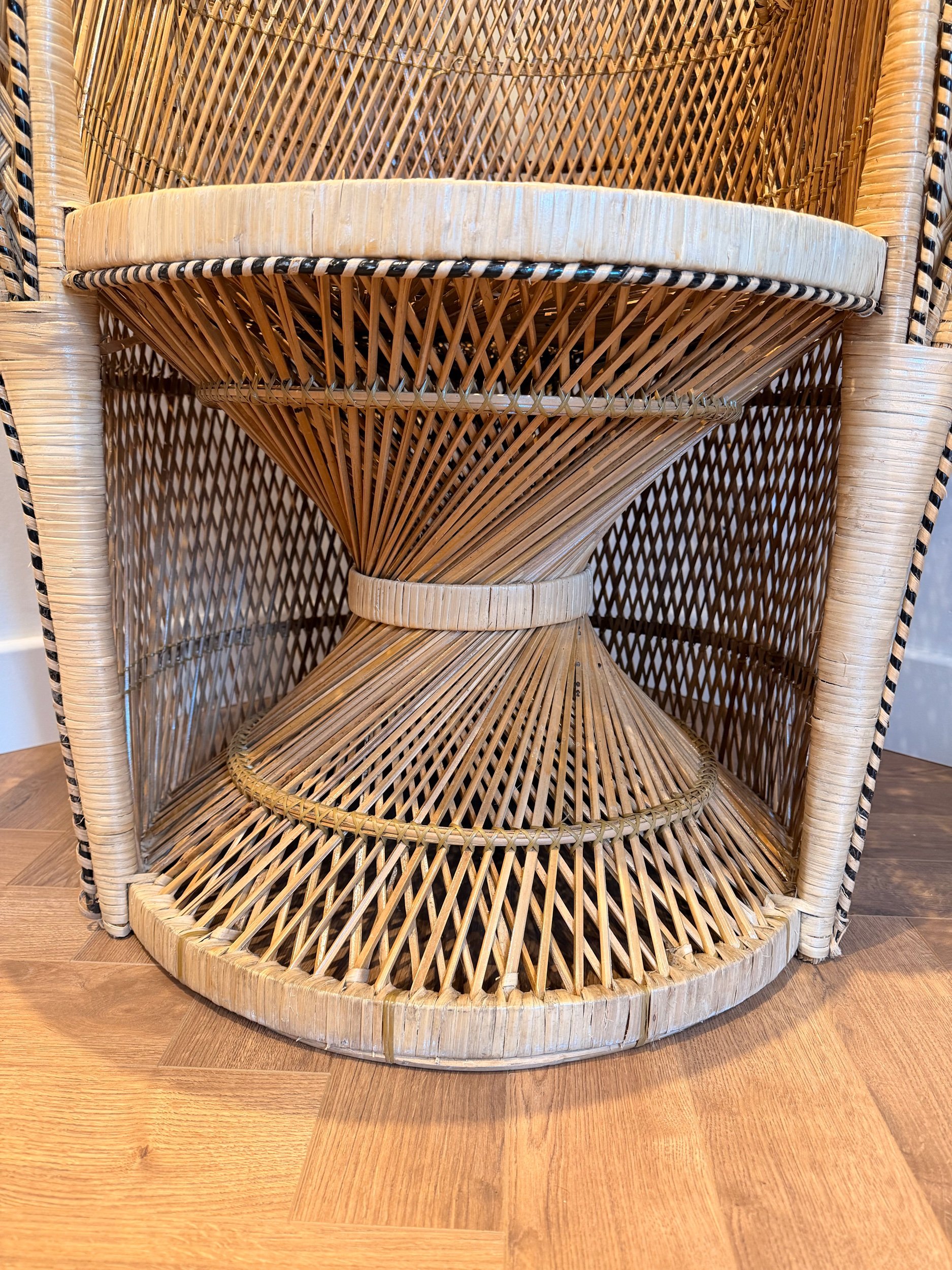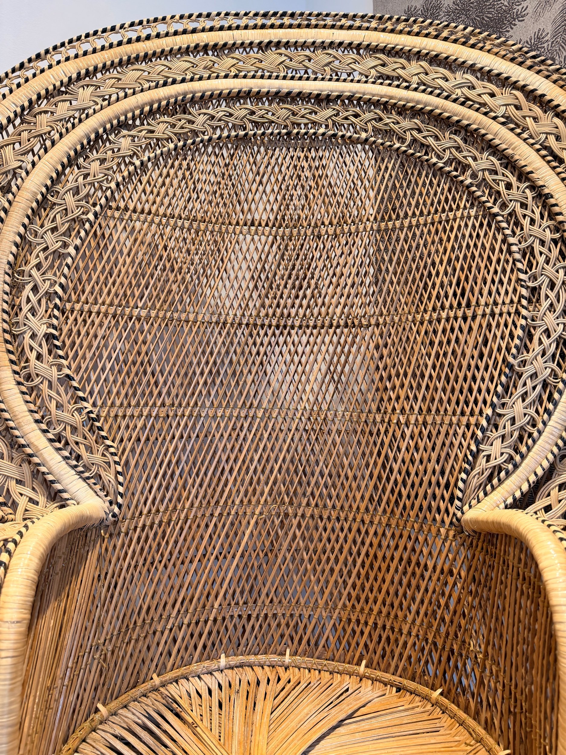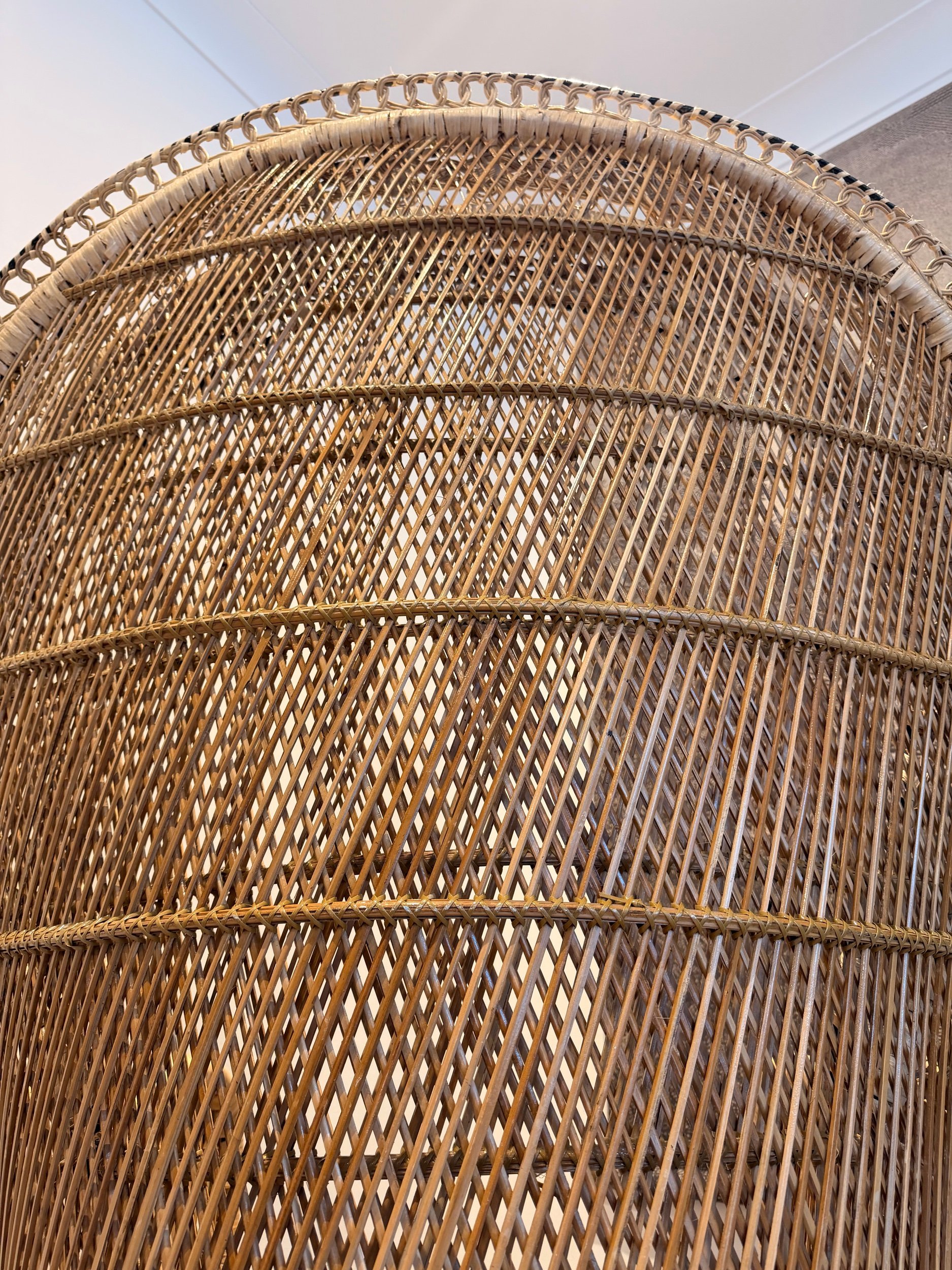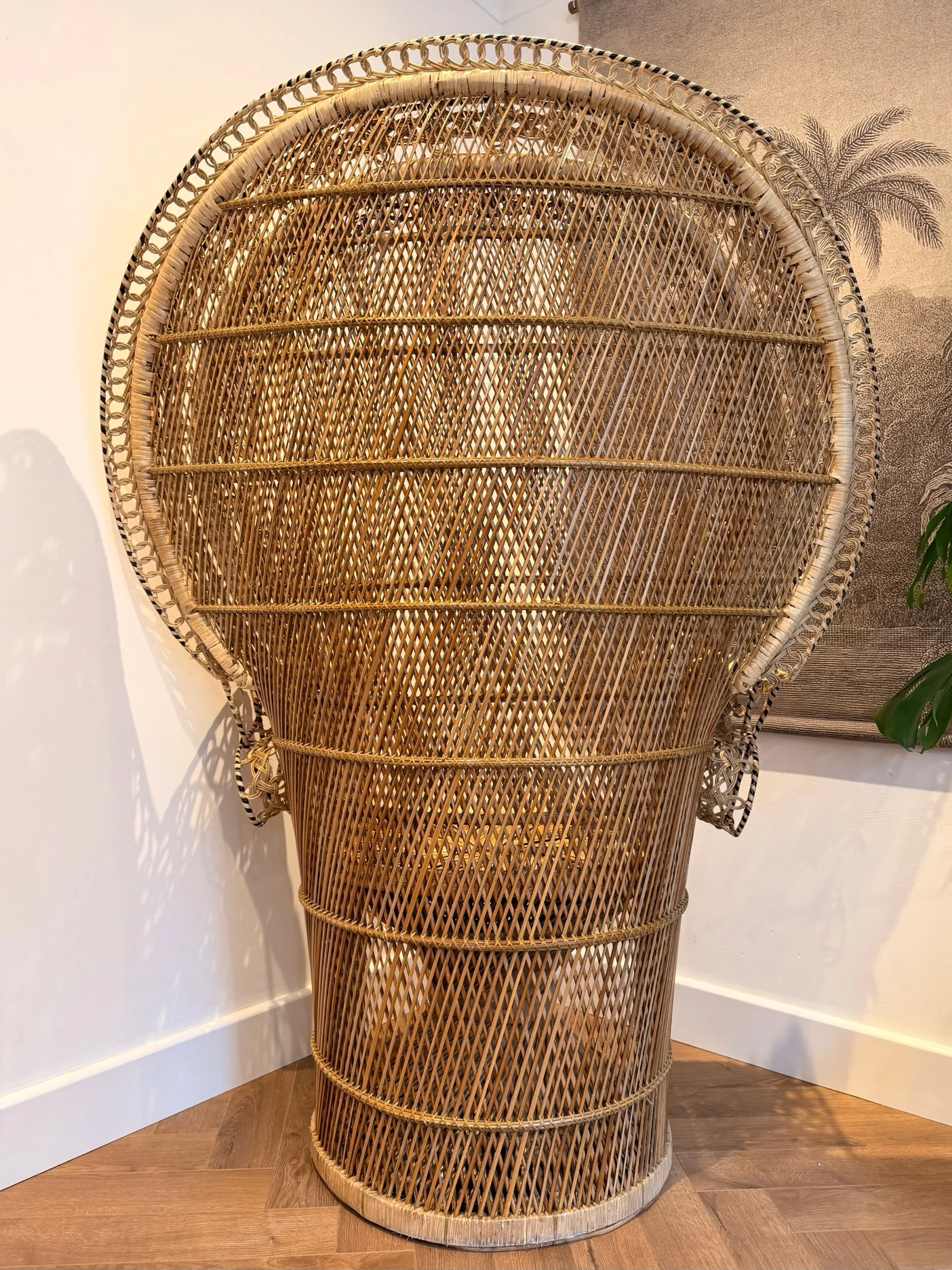 A stunning, eye-catching, extra large Peacock chair! (And it is very, very large!) Hard to find another like it in such great condition for a vintage item of this size and with so much detail. No snags and still very sturdy. It’s been well looked after. This piece came all the way from the Philippines originally, so is authentically crafted by the masters in this type of work! There’s such attention to detail - A key feature being the intricate patterns in the back rest and arms, with intricate hand woven patterns of multi colours and multi texture. Also, just how large the fan back rest is is a statement in itself. Oozing rustic bohemian character, it would make a stand out piece of furniture for your home! It would make a fabulous statement chair in your room, or in a ‘reading nook’ perhaps - whatever suits your home needs. They’re also really popular for photography props or events. This chair has been fully restored from head to toe, any damage fixed, cleaned throughly, and waxed all over to rejuvenate the wicker. Please see close ups for quality of finish, we’re proud to restore items to a high standard.