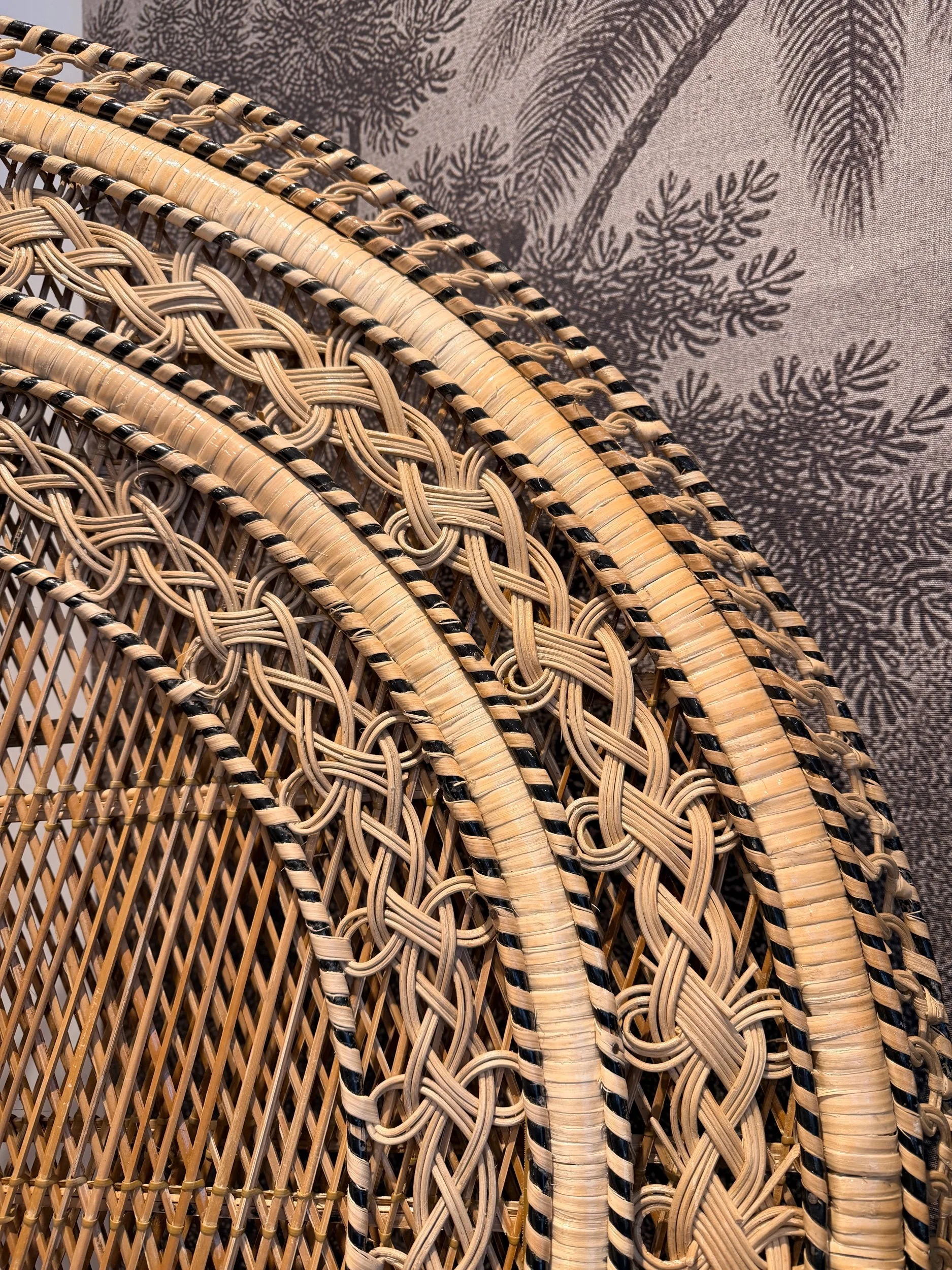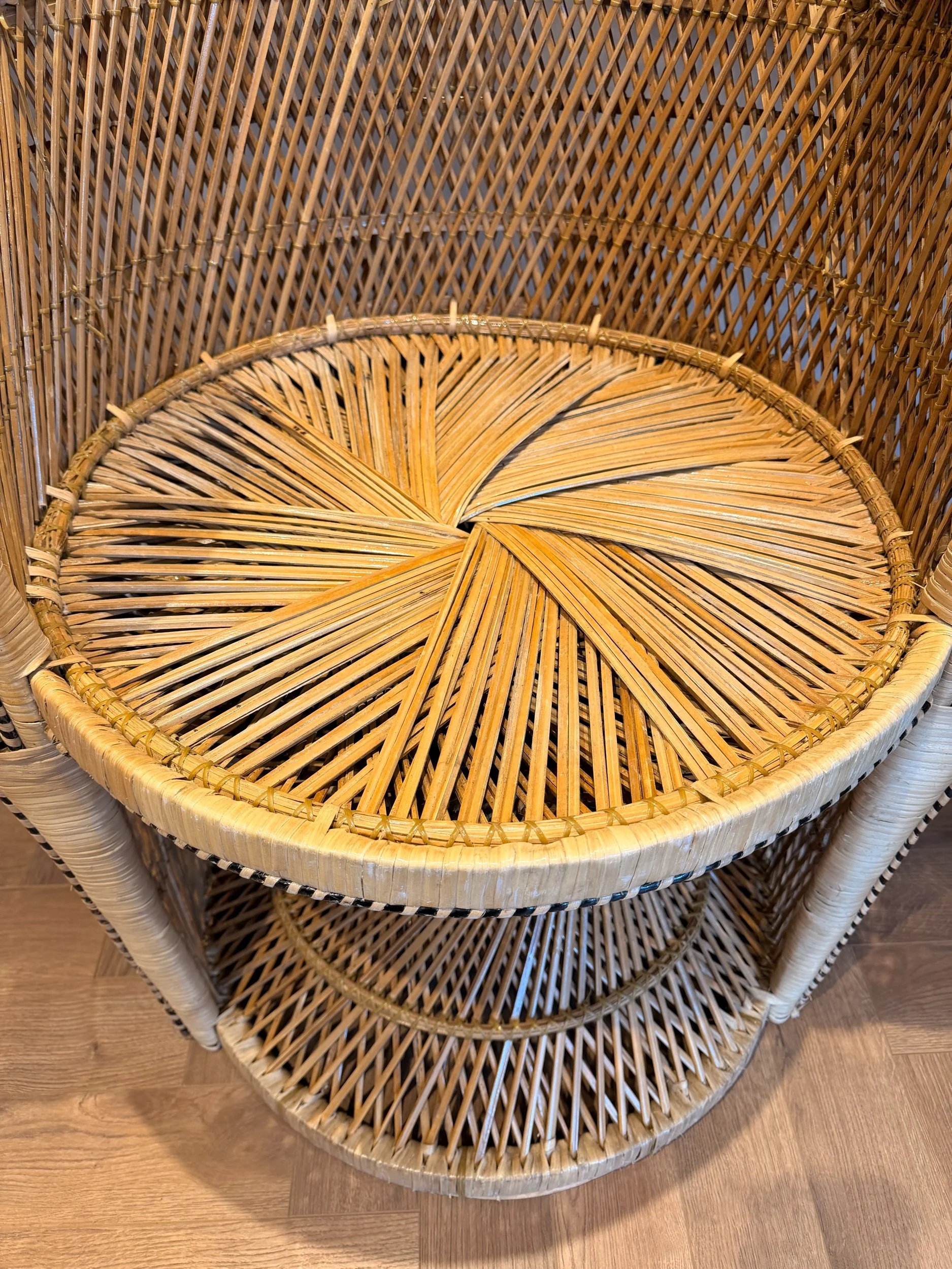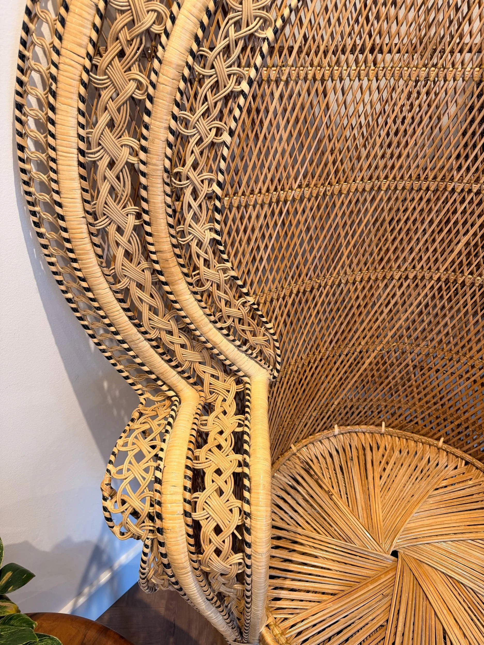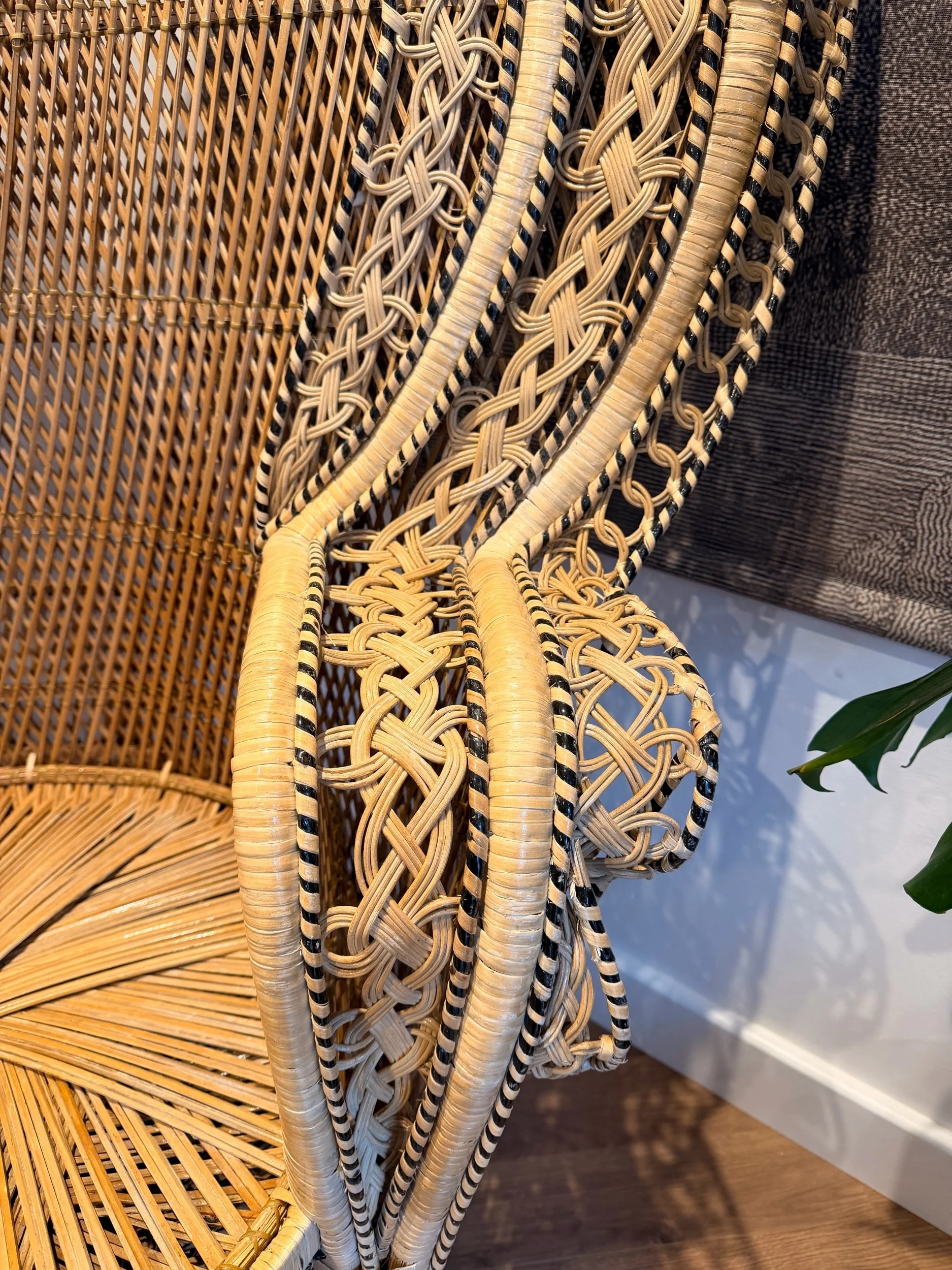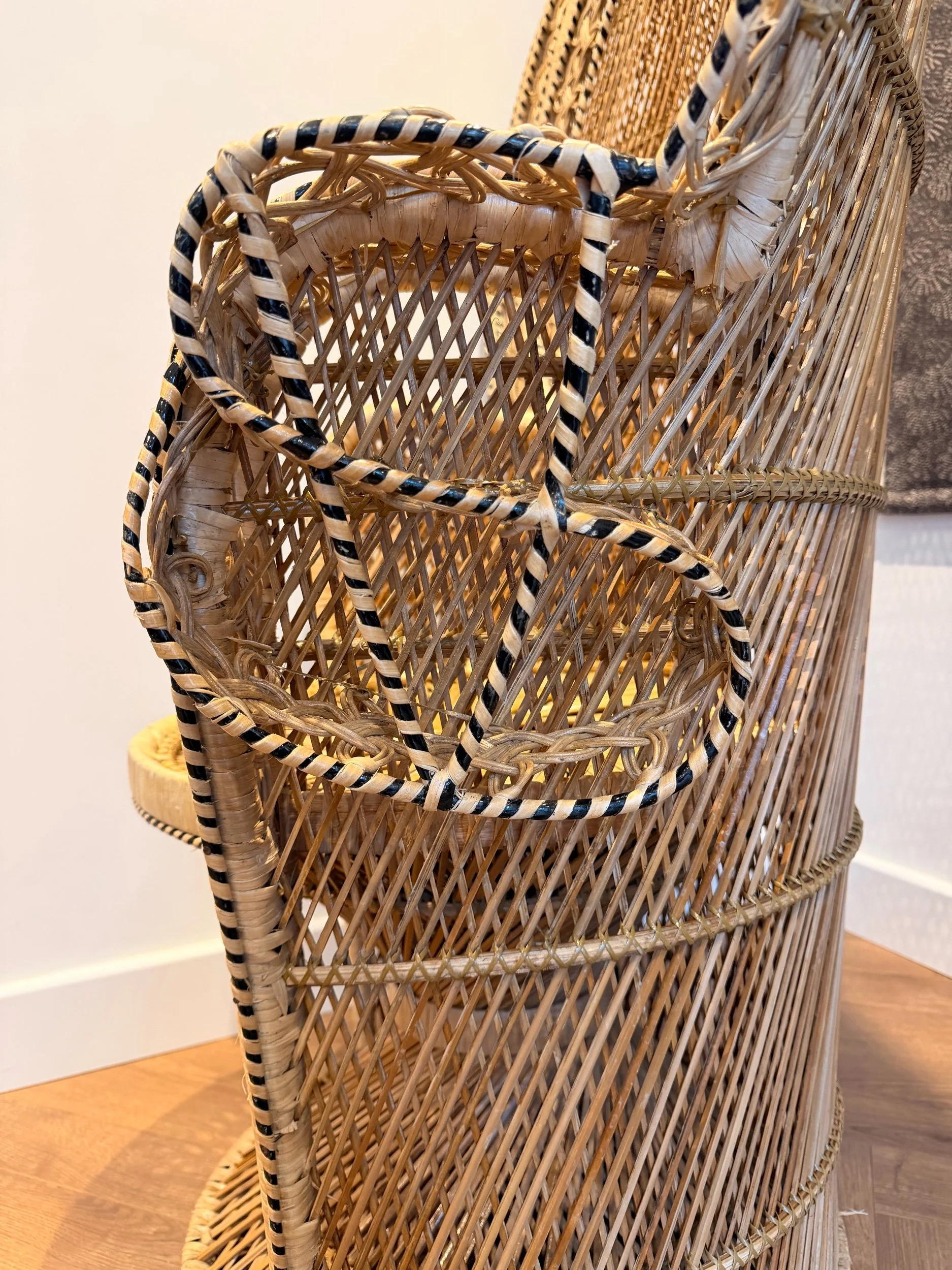 A stunning, eye-catching, extra large Peacock chair! (And it is very, very large!) Hard to find another like it in such great condition for a vintage item of this size and with so much detail. No snags and still very sturdy. It’s been well looked after. This piece came all the way from the Philippines originally, so is authentically crafted by the masters in this type of work! There’s such attention to detail - A key feature being the intricate patterns in the back rest and arms, with intricate hand woven patterns of multi colours and multi texture. Also, just how large the fan back rest is is a statement in itself. Oozing rustic bohemian character, it would make a stand out piece of furniture for your home! It would make a fabulous statement chair in your room, or in a ‘reading nook’ perhaps - whatever suits your home needs. They’re also really popular for photography props or events. This chair has been fully restored from head to toe, any damage fixed, cleaned throughly, and waxed all over to rejuvenate the wicker. Please see close ups for quality of finish, we’re proud to restore items to a high standard.