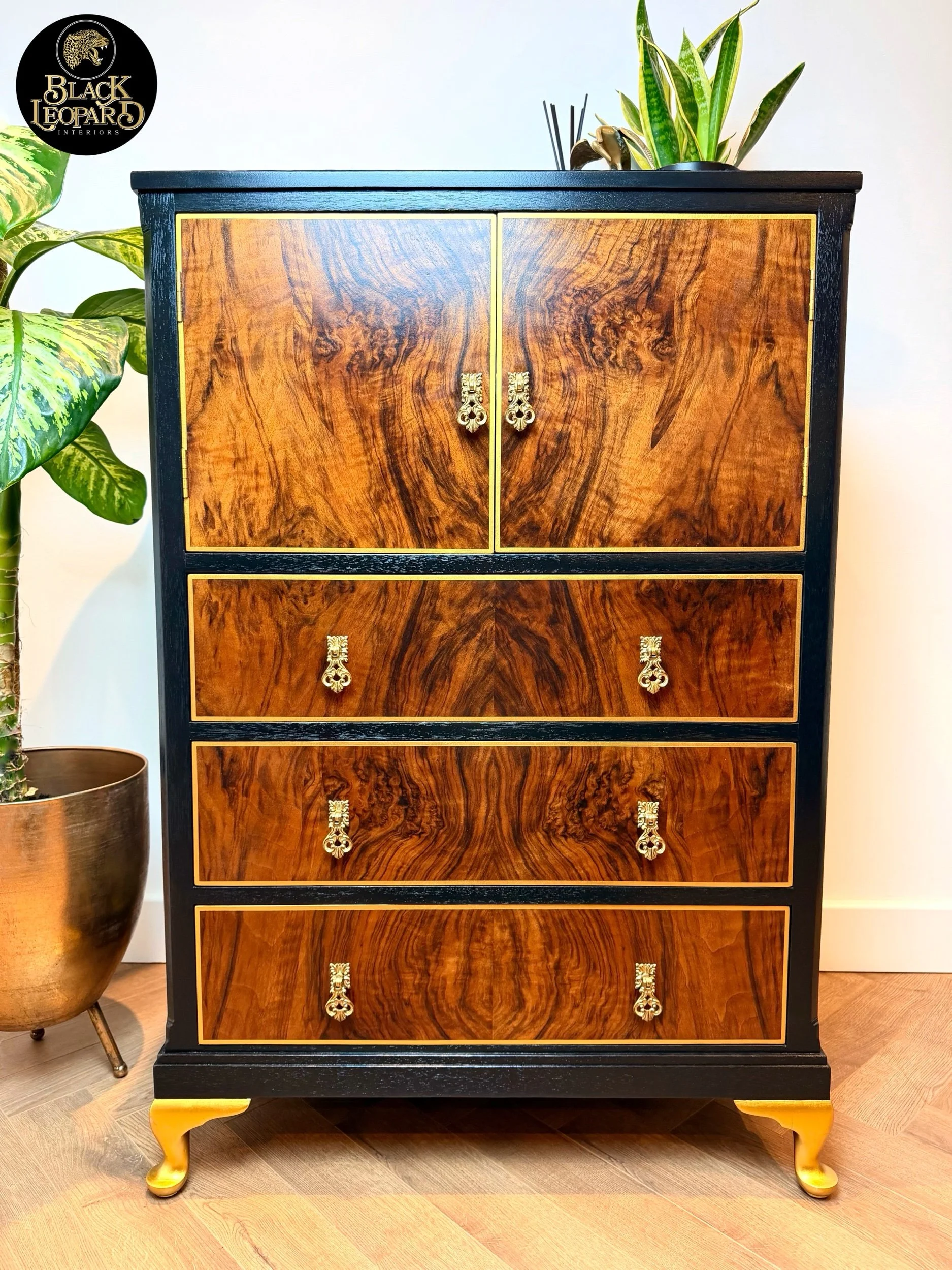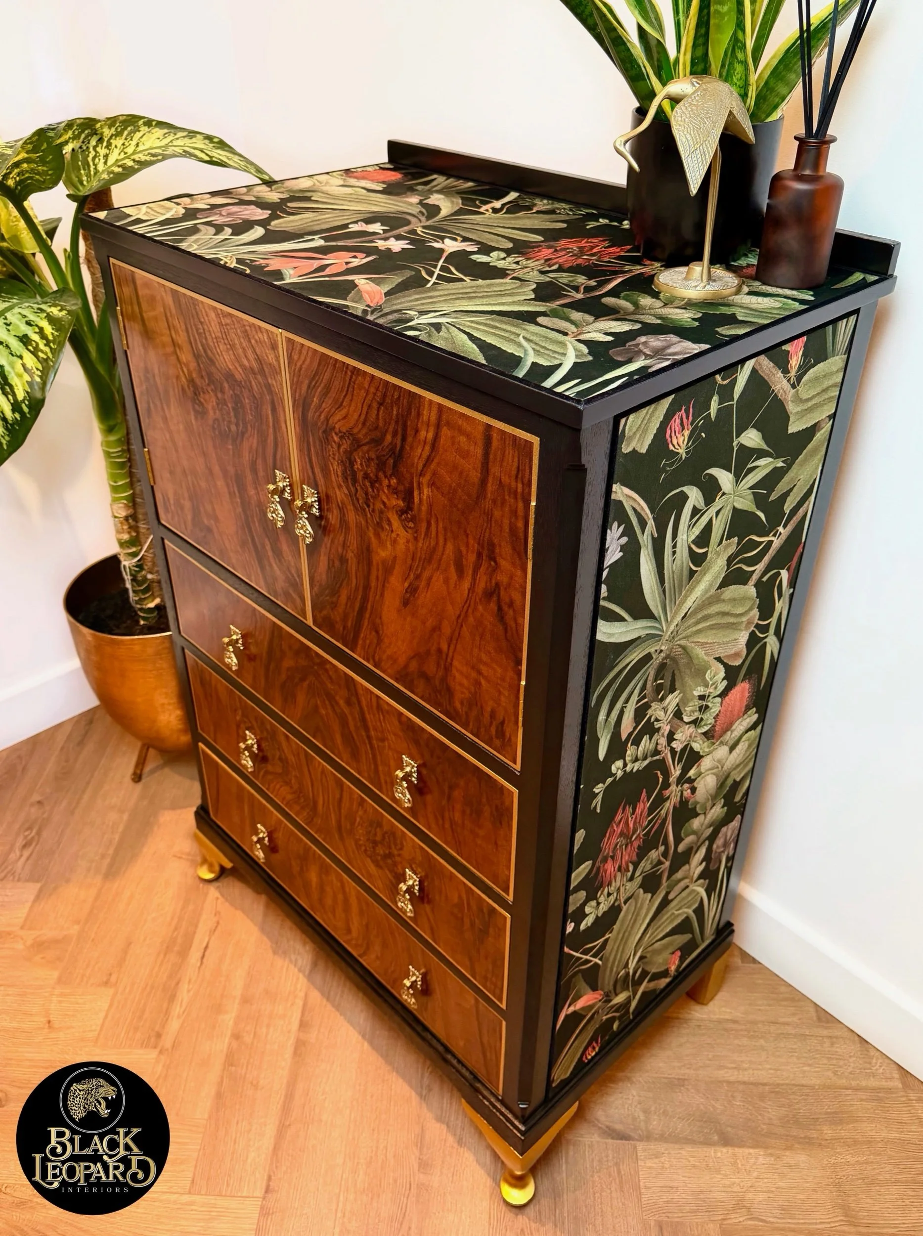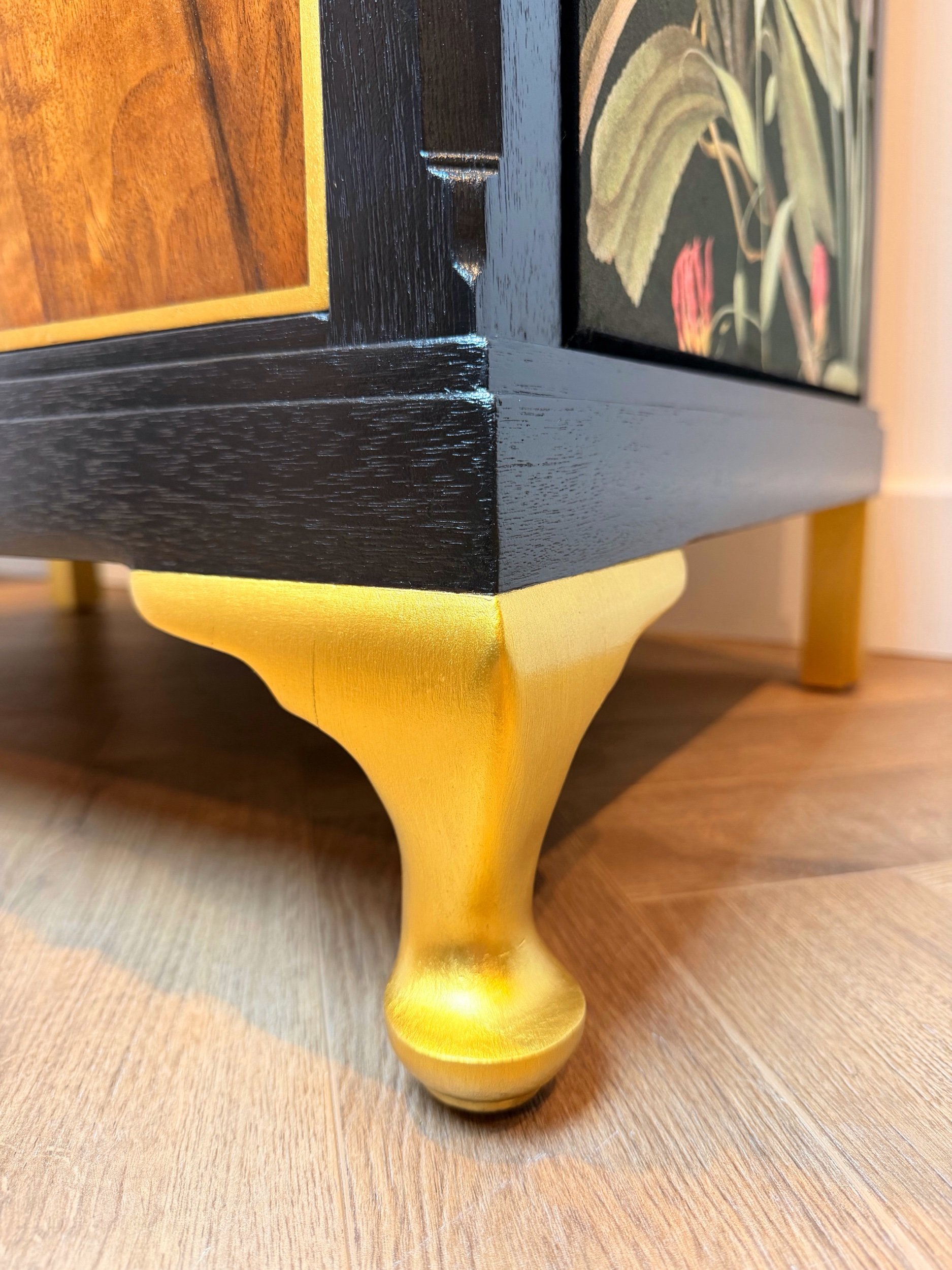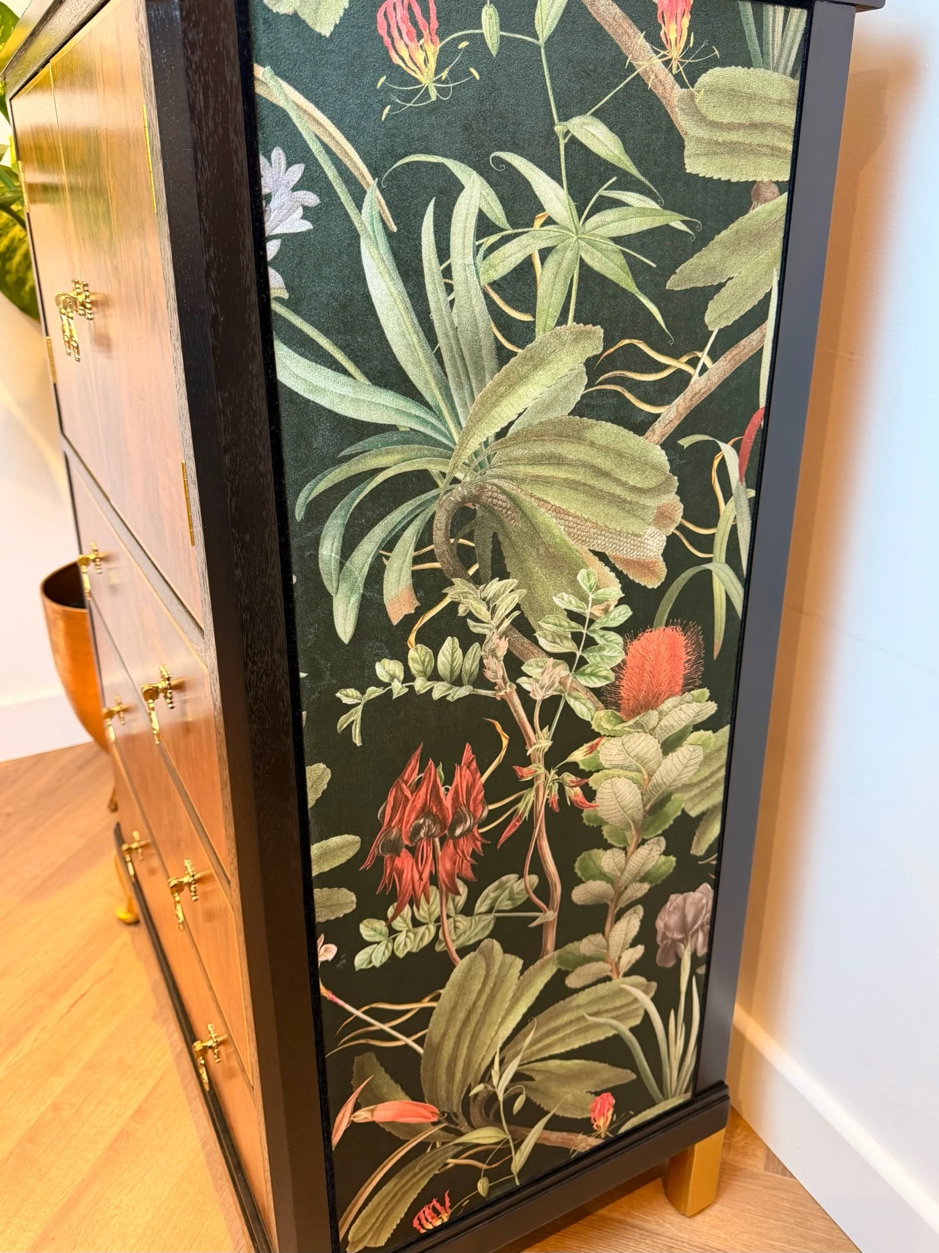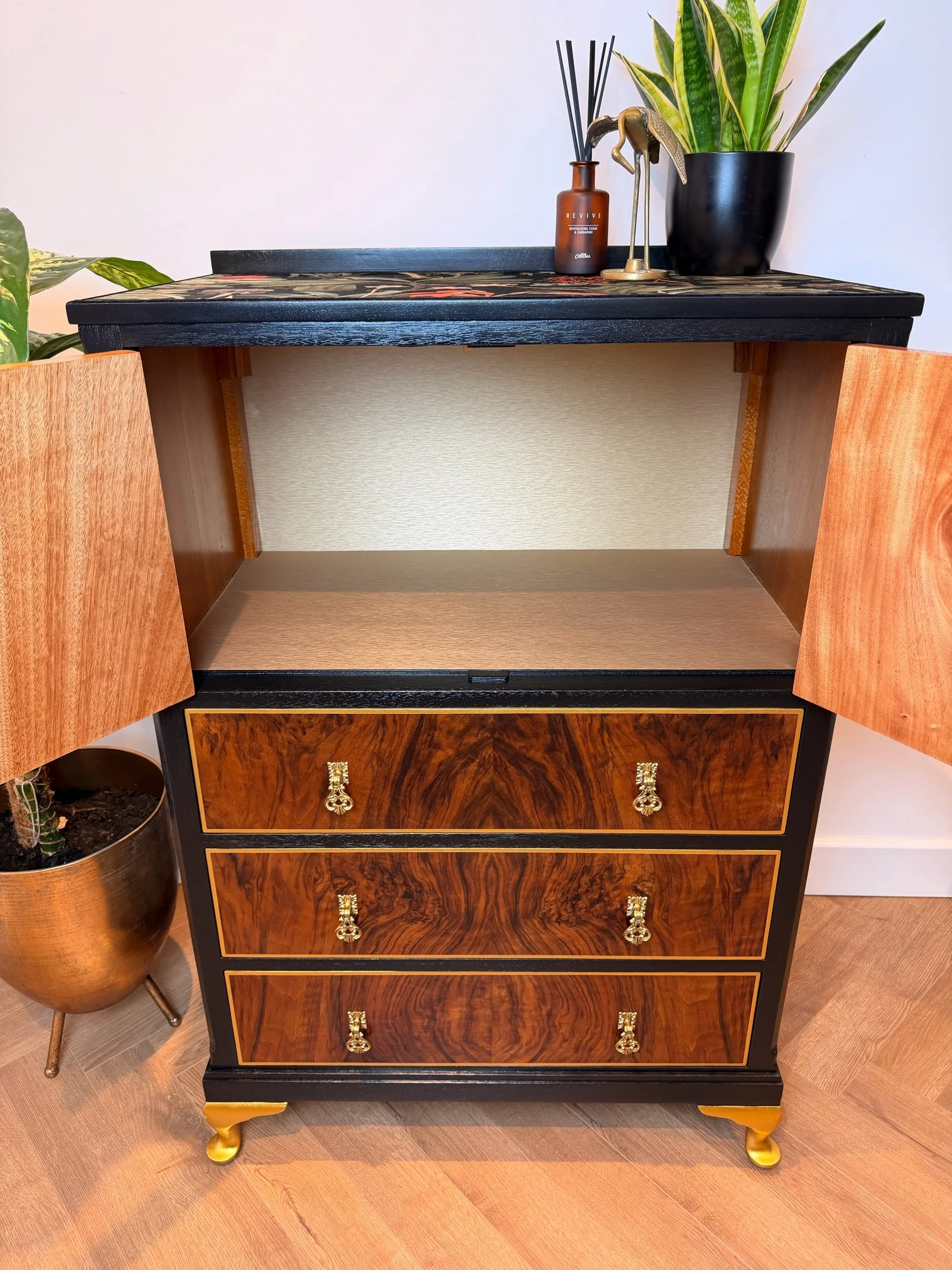 A gorgeous, eye-catching, one of a kind tallboy cabinet! You won’t see another like it as our designs are unique to each individual item we refinish. We also use velvet to embellish our pieces - not the usual wallpaper you see on the market, making this item extra extravagant with a luxury feel. The light shimmers off of the velvet and gives a really deep, rich tone to the warm colours in the fabric. This piece is so beautiful, with so much unique vintage charm - a stand out piece of furniture for your home! It would make a fabulous little drinks cabinet or sideboard/ console - whatever suits your home needs as it has plenty of storage with an open top section and 3 drawers. This cabinet has been fully restored and revitalised from head to toe with love and passion to create a new design that brings a refreshed, modern touch mixed with vintage charm. Key features such as this stunning vintage floral VELVET fabric, that wraps both sides and over the top, compliments the warmth and character of the piece. And of course showcasing and framing the main feature being the stunning woodgrain on the front of this cabinet! All refinished by hand with careful attention to detail and high quality finishing, it’s now ready to be loved for many more years to come! Please see close ups for quality of finish, we’re proud to restore items to a high standard.